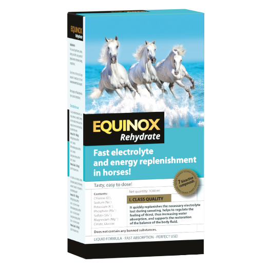 La composición de EQUINOX Rehydrate es semejante a la cantidad y la proporción de los electrolitos perdidos durante la sudoración. La glucosa es una fuente de energía que se aprovecha inmediatamente e intensifica la absorción de los electrolitos y del agua en el intestino delgado. El citrato de sodio, por su efecto neutralizante del ácido láctico contribuye a la rápida regeneración de la musculatura (Síndrome Tying up).